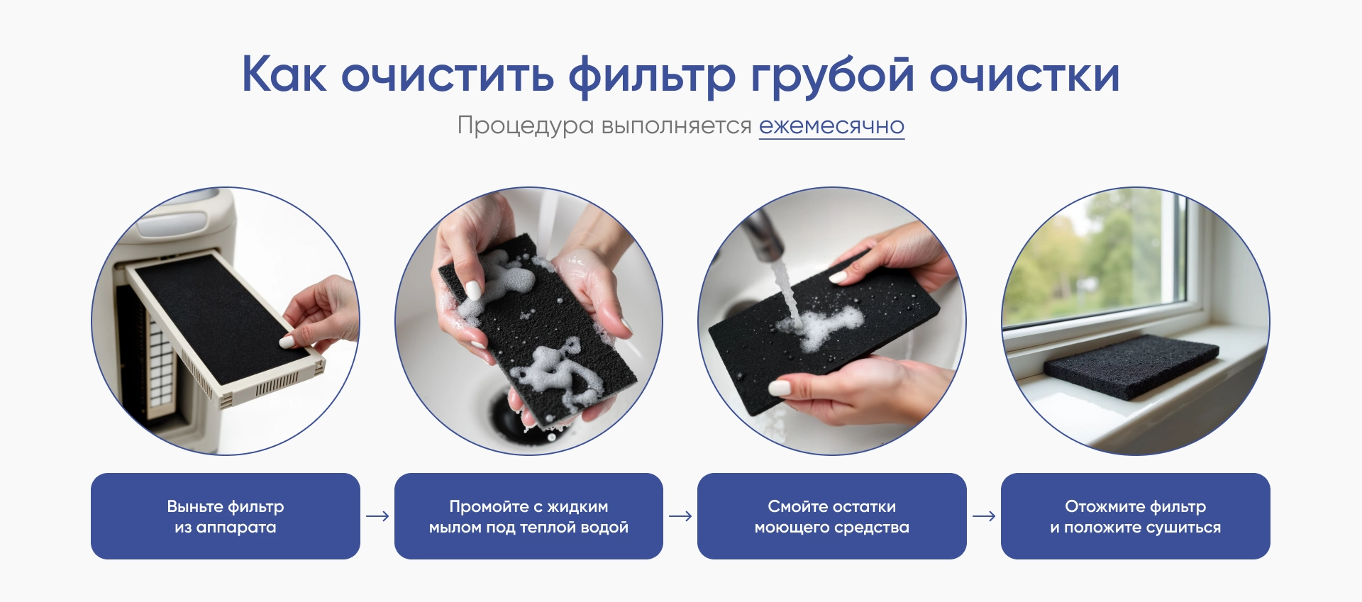 Делать это нужно каждый день при помощи мыльной воды. Обязательно расскажите об этом родственникам пациента. Это не менее важно, чем чистка фильтров.