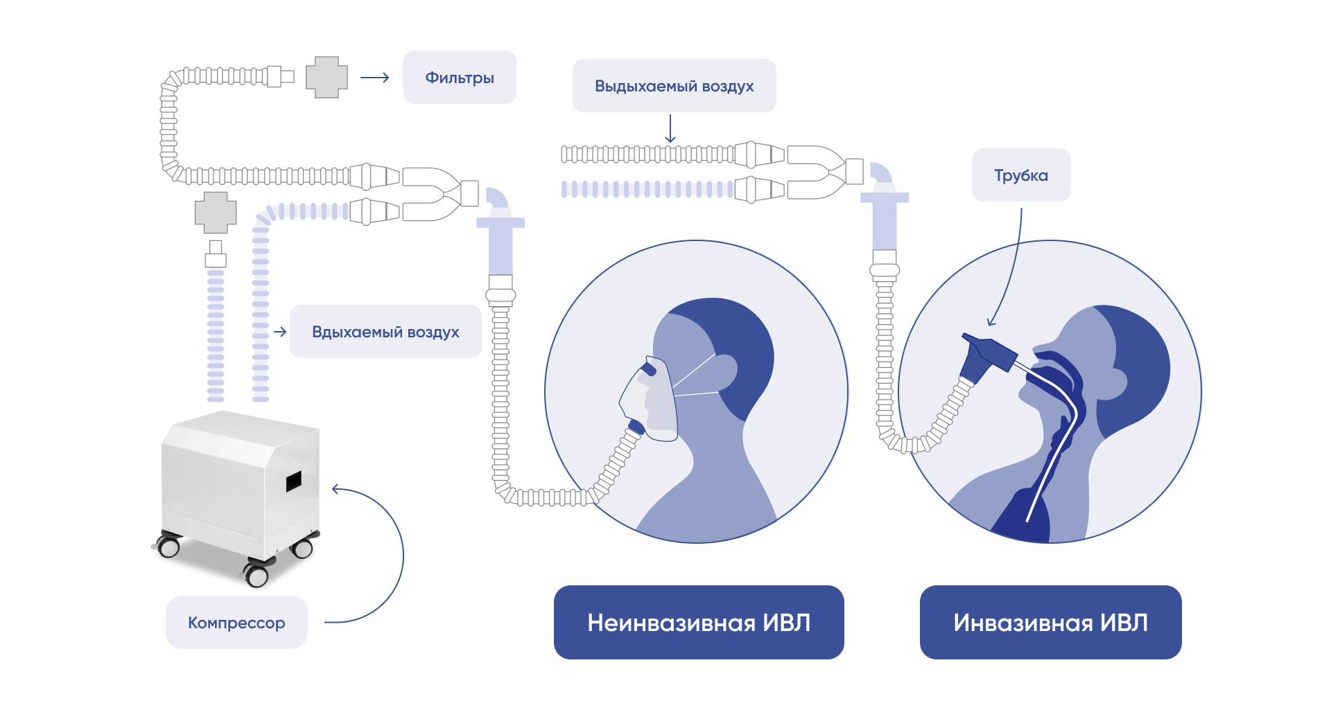 После запуска прибора компрессор под давлением подает в легкие поток воздуха с необходимой концентрацией кислорода. Дыхательная смесь проходит через фильтры и увлажнители, затем поступает в дыхательный контур, который включает в себя трубку, маску или другой интерфейс, после чего пациент совершает "искусственный вдох".