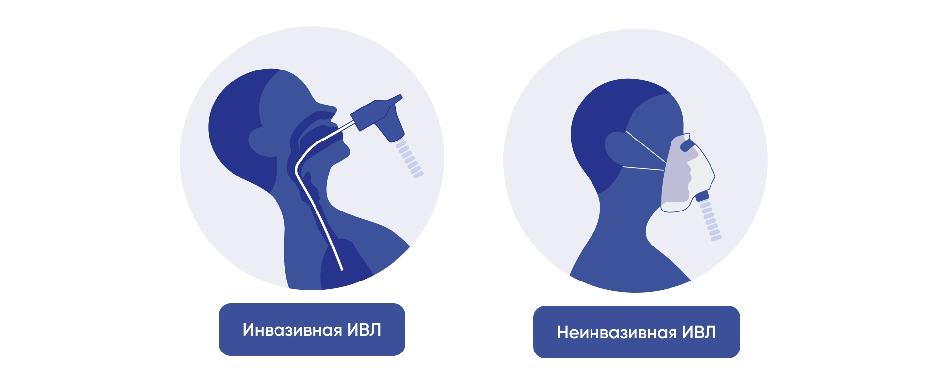| Метод поддержания дыхания, при котором проводится интубация (введение трубки в трахею, либо через носовой или ротовой проход) и использование механической вентиляции для выталкивания воздуха в легкие | Метод поддержания дыхания без необходимости интубации. Искусственная вентиляция легких этого вида используется как в лечебных учреждениях, так и в домашних условиях. Такой метод респираторной поддержки подразумевает использование маски или носовых катетеров, через которые поступает воздух под давлением |
