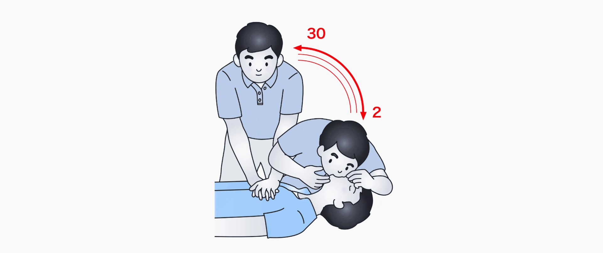 После 30 надавливаний на грудную клетку выполните 2 вдувания, длительность каждого из которых около 1 секунды. Интервал между вдуваниями должен быть не более 10 секунд.