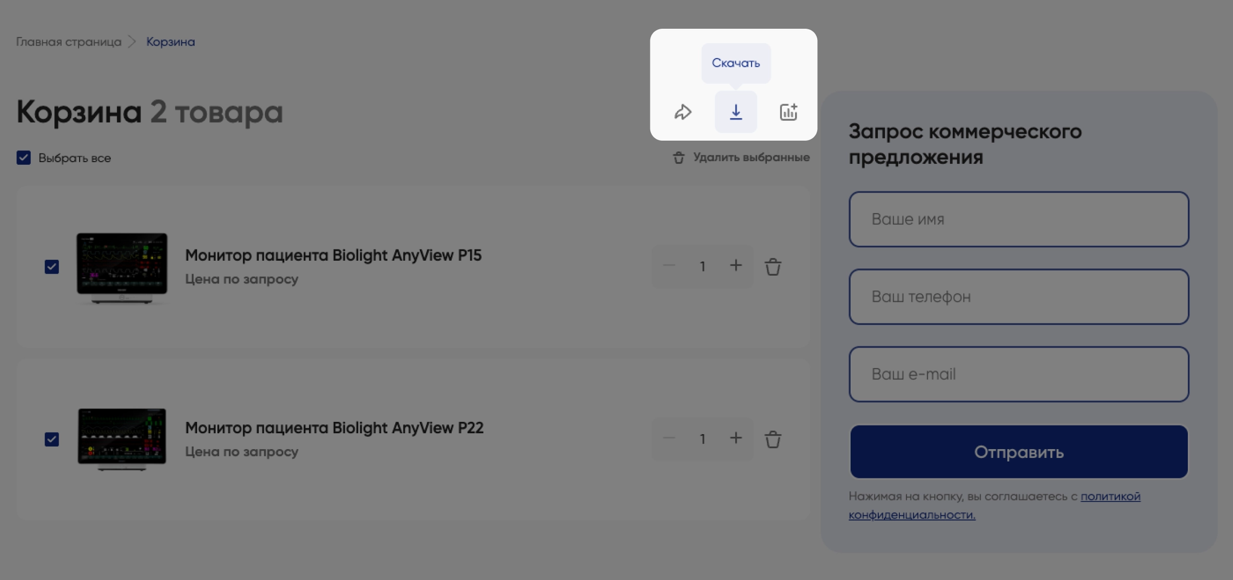 Часто при работе с крупными проектами приходится запрашивать предложения на несколько товаров. Чтобы избавить посетителей сайта от заполнения одной и той же формы несколько раз, мы добавили на сайт корзину.