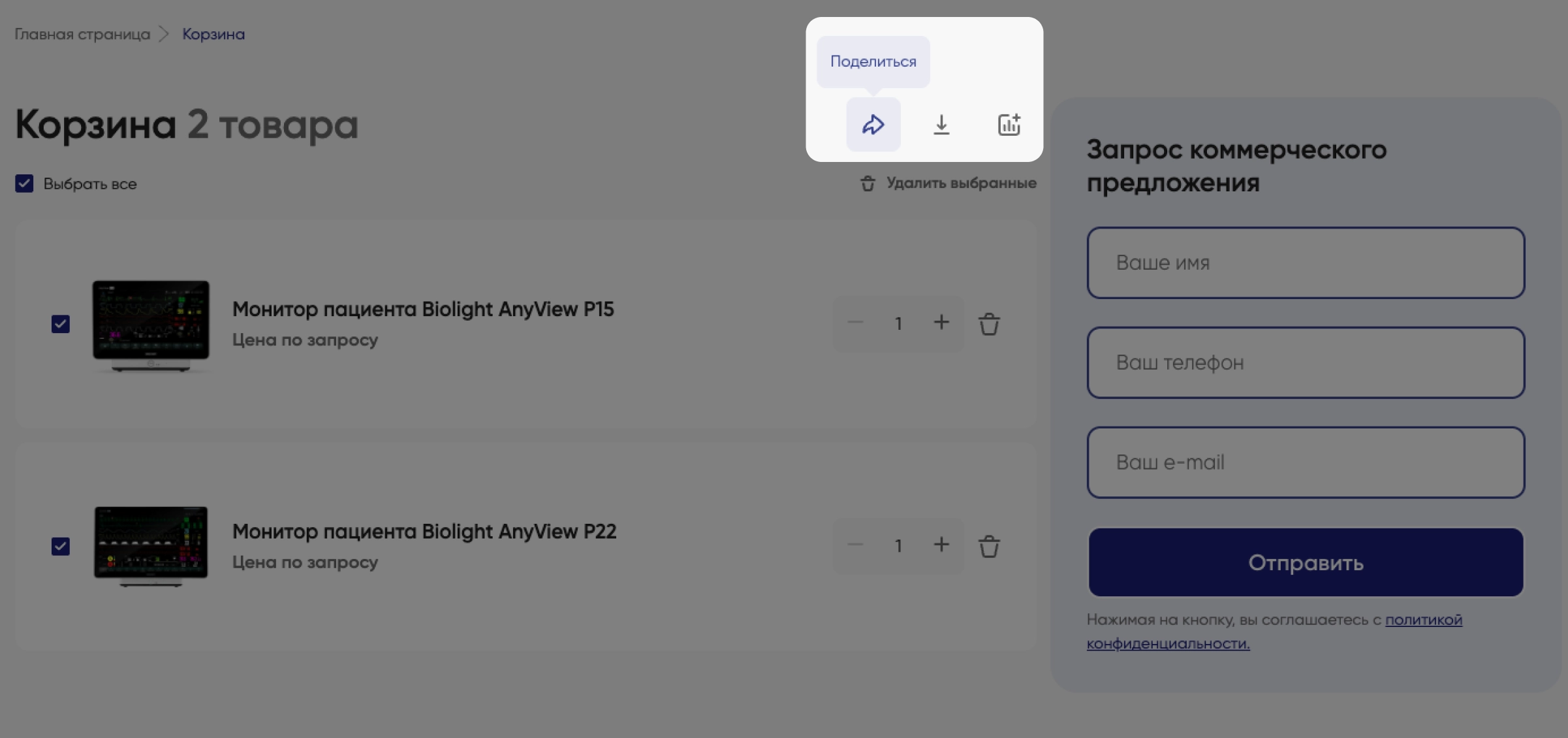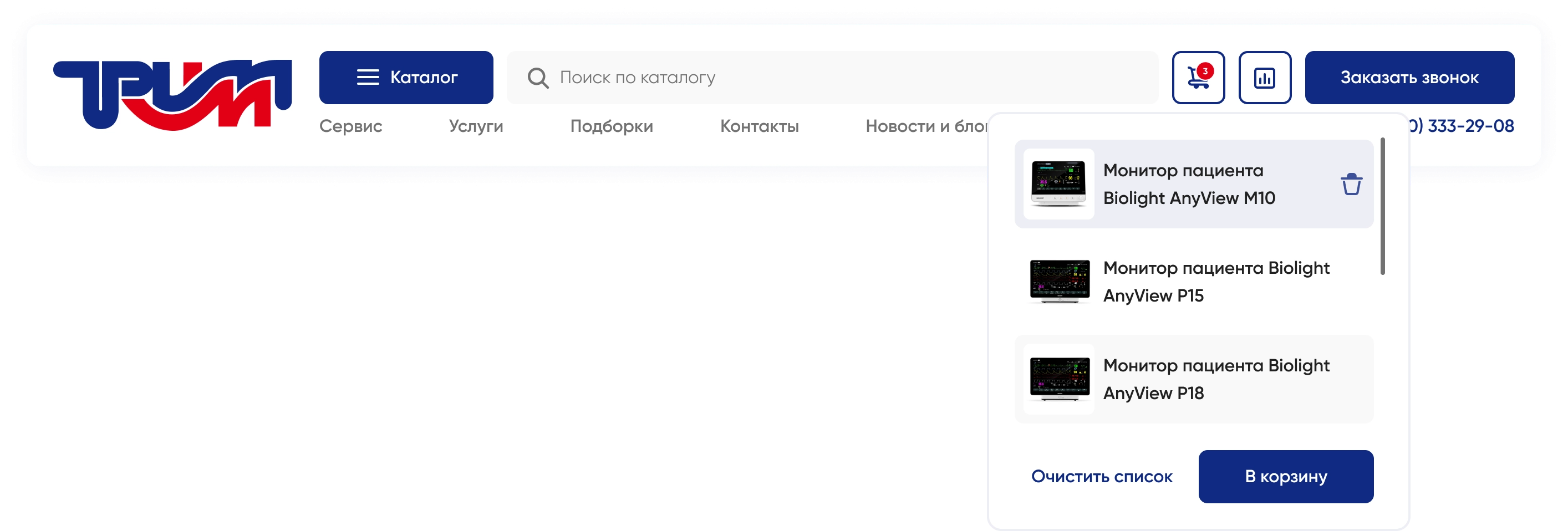 Чтобы добавить товар в корзину, нажмите на соответствующую иконку. Расположение иконки зависит от страницы: обычно она рядом с кнопкой запроса коммерческого предложения. Перейти к списку товаров в корзине можно через виджет в верхней части сайта.