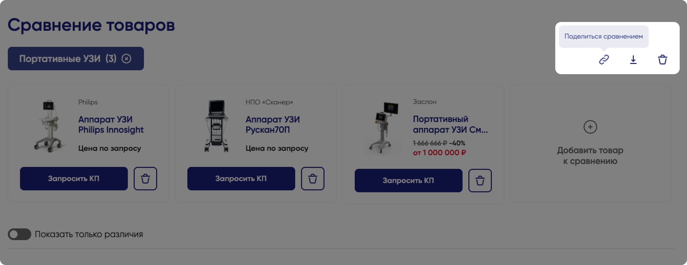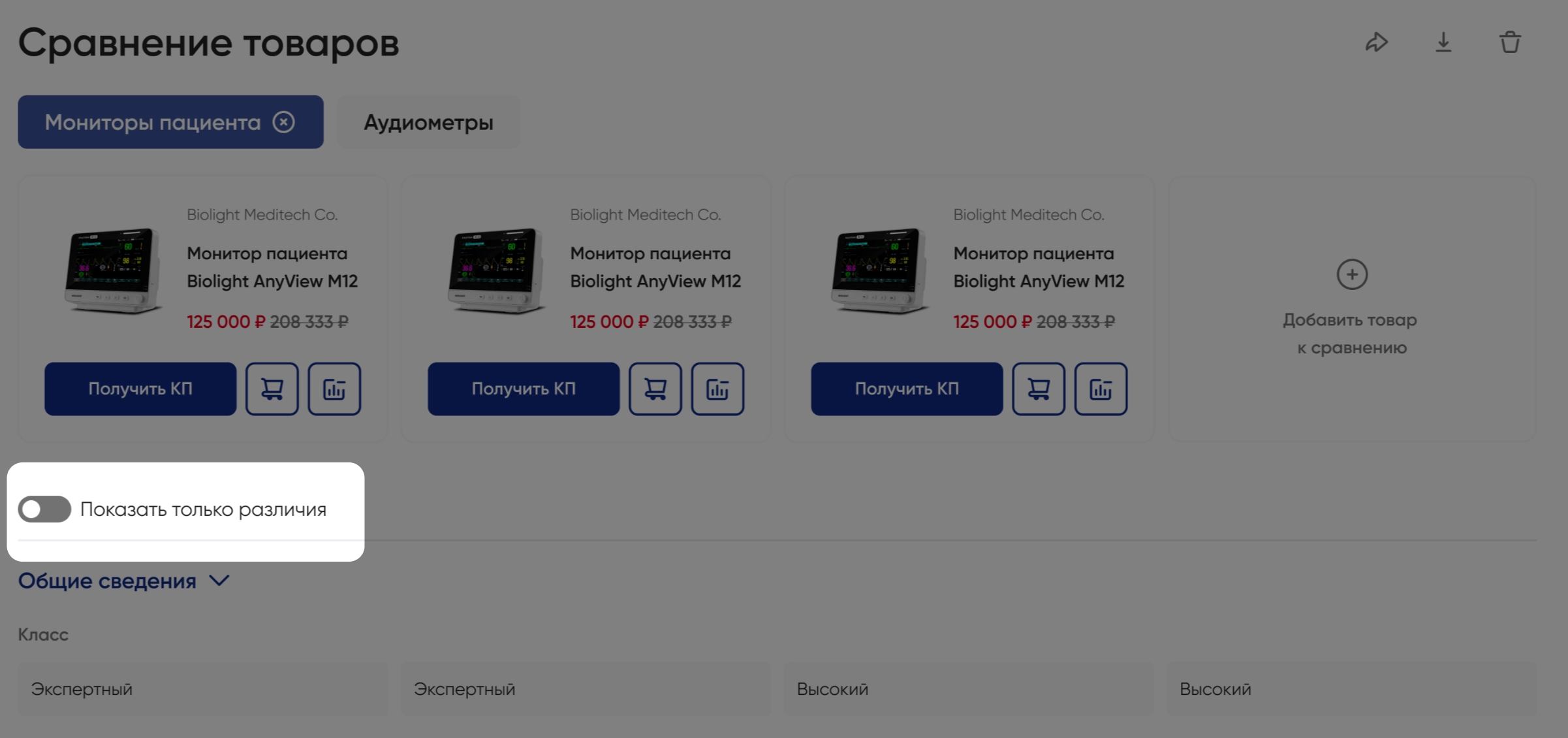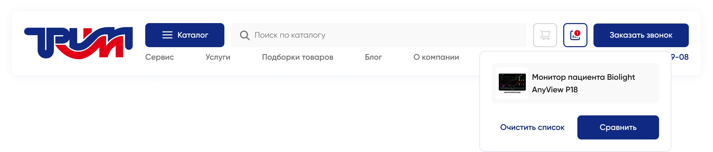Медицинское оборудование — сложный специализированный товар. Чтобы помочь специалисту не ошибиться в выборе, мы добавили на сайт возможность сравнивать товары по характеристикам.