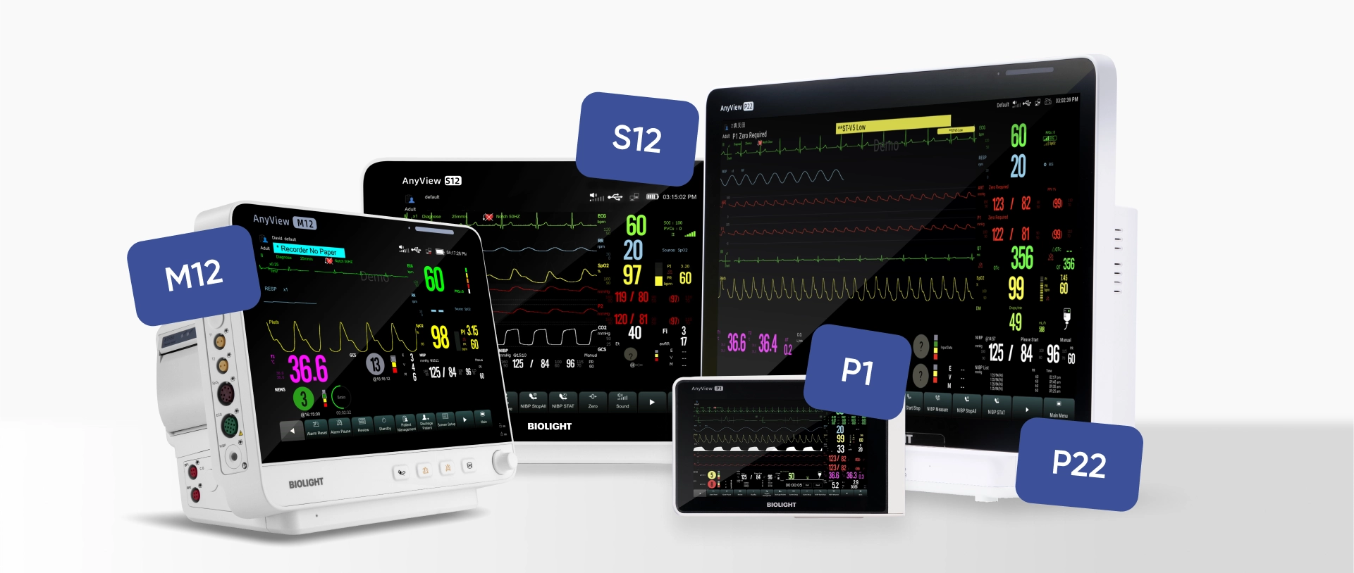 - Монитор пациента Biolight AnyView M12 — бюджетный монитор с эргономичным корпусом, конструкцией без вентилятора и 12-дюймовым дисплеем. Подходит для использования в лечебном учреждении, во время транспортировки между отделениями и больницами