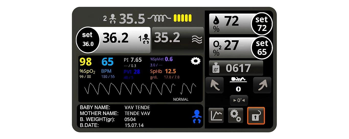 Для проведения взвешивания достаточно приподнять новорожденного на несколько секунд; после возвращения ребенка на ложе инкубатора его вес автоматически отображается на экране.