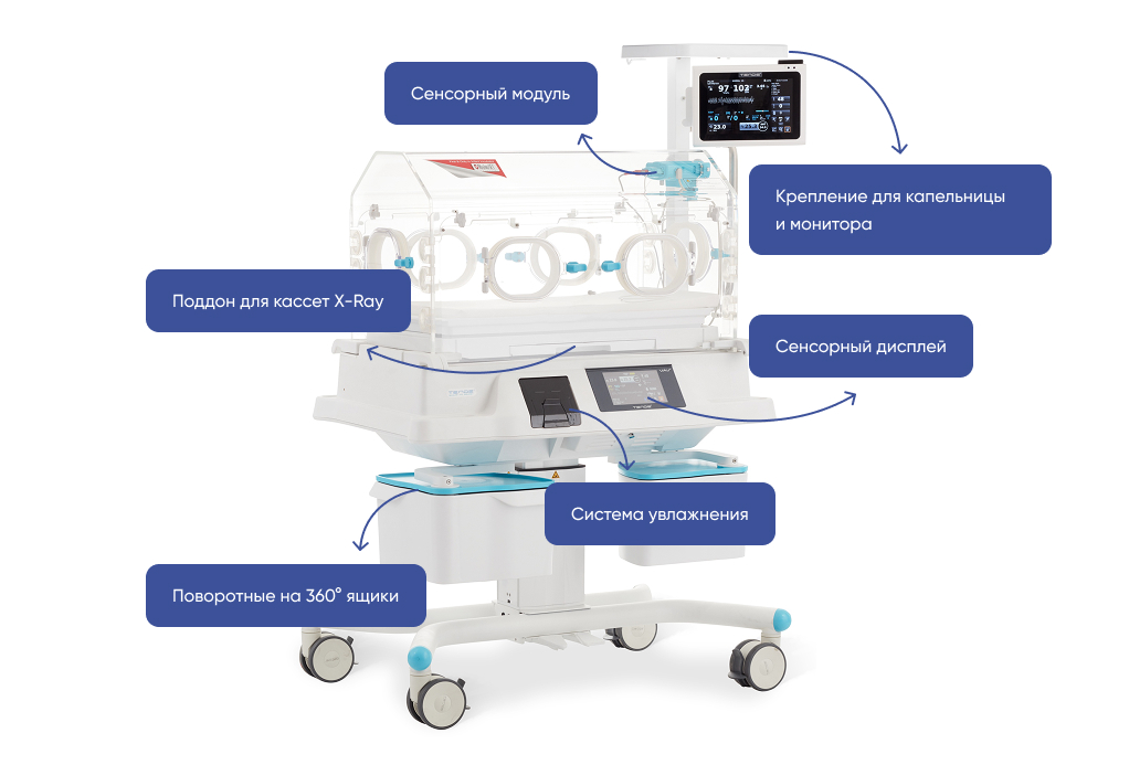 TENDE VAV — современный инкубатор для интенсивной терапии новорожденных с интеллектуальными алгоритмами управления микроклиматом. Поддерживает постоянную температуру, влажность, уровень кислорода и мониторирует состояние пациента.
