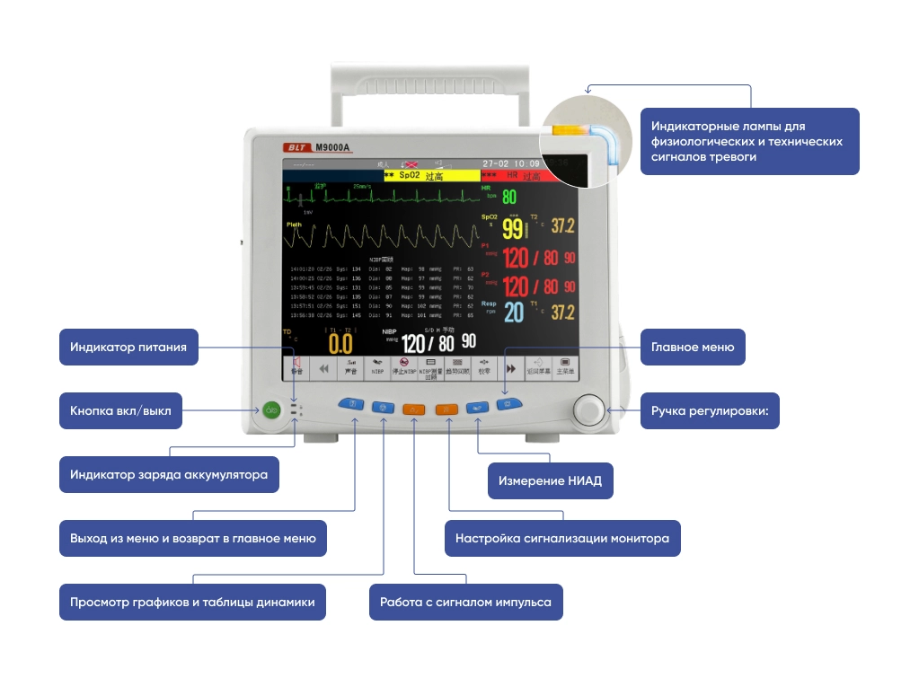 - SpO2 и частота пульса с применением технологий BLT, Masimo SET или Nellcor
