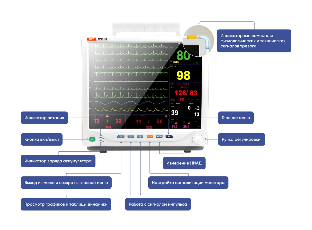 М9500 подает два типа сигнала тревоги: физиологический и технический. Физиологический вызван опасным для жизни состоянием пациента, технический — срабатывает при обнаружении неисправности прибора, например, когда процессы контроля становятся технически невозможными, а результаты мониторинга – неправдоподобными.
