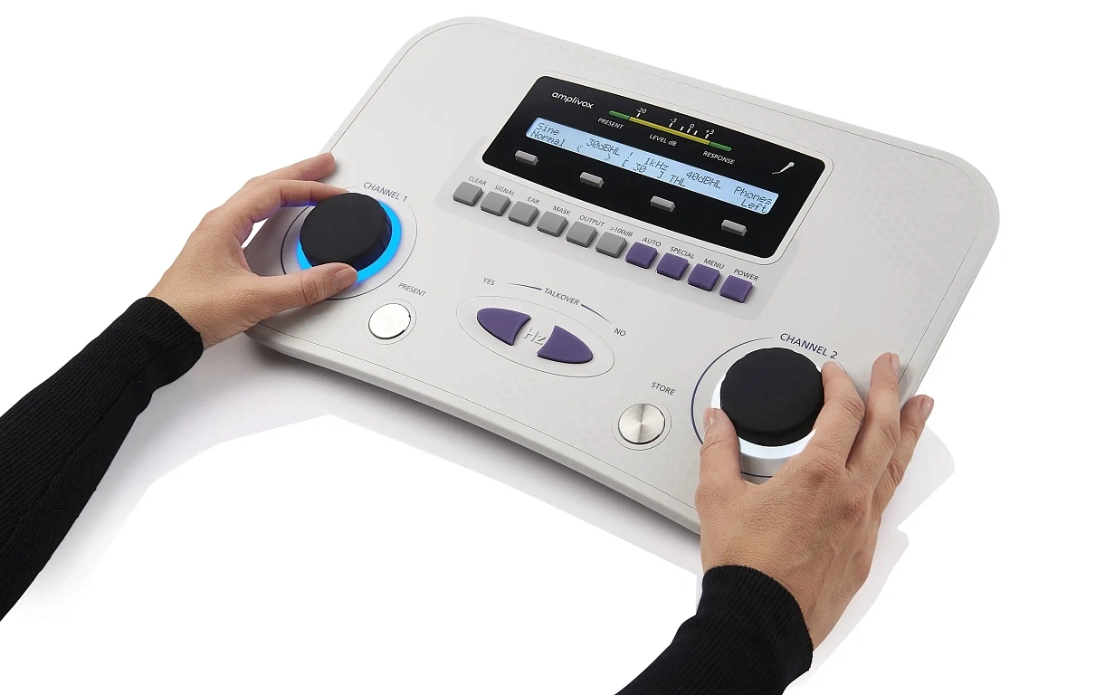 Профессиональный двухканальный аудиометр Amplivox 270+ позволяет исследовать костную и воздушную проводимость как вручную, так и автоматически. В комплекте с устройством прилагается сумка для транспортировки — удобно для выездных обследований. В аудиометре отсутствует встроенный аккумулятор. Устройство работает от сети.