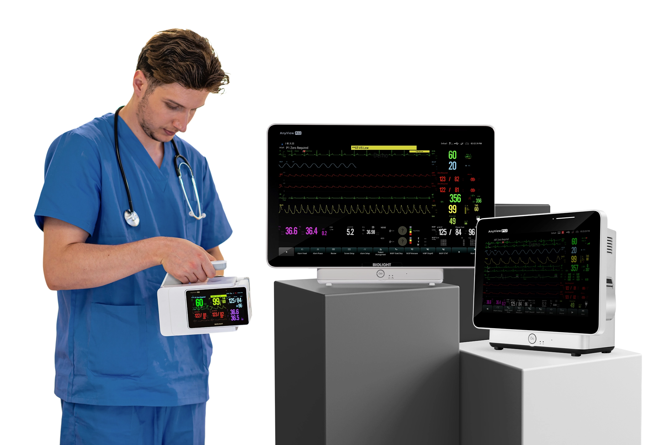 Biolight AnyView P12 - это монитор пациента с 12,1-дюймовым сенсорным экраном и 4 модульными слотами. Он поддерживает широкий спектр параметров, включая 2-IBP модуля, 2-Temp модуля, Nellcor SpO2 модуль и другие.