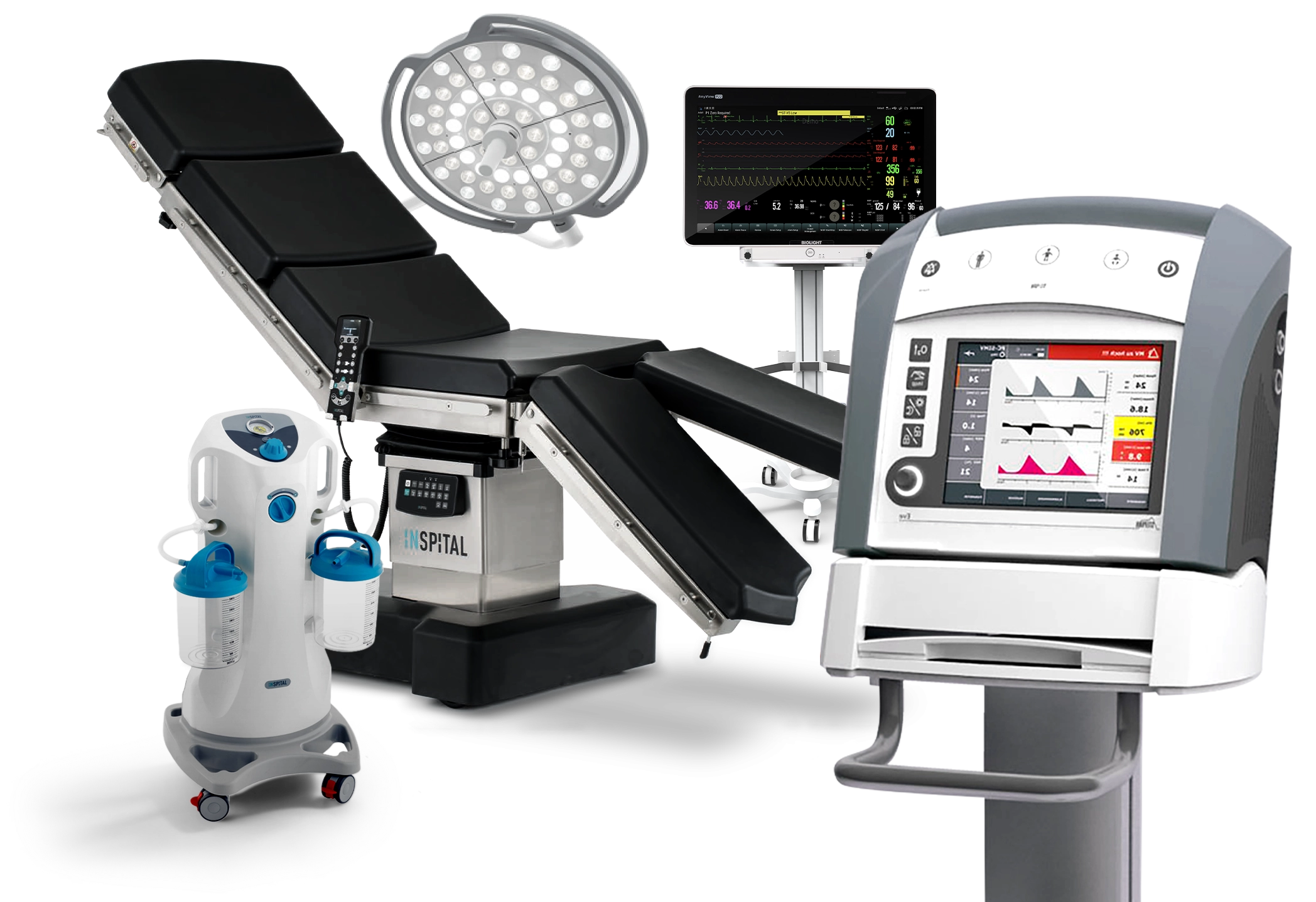 Универсальная операционная: бариатрический операционный стол с электрическим приводом и высокой грузоподъемностью, аспиратор для удаления жидкостей из организма, мобильный светильник с системой резервного питания, монитор пациента с 22-дюймовым сенсорным экраном и 6 модульными слотами и стационарный аппарат ИВЛ для всех категорий пациентов. Демонстрация операционного блока будет проходить на стенде №8D060 в рамках выставки «Здравоохранения-2025».